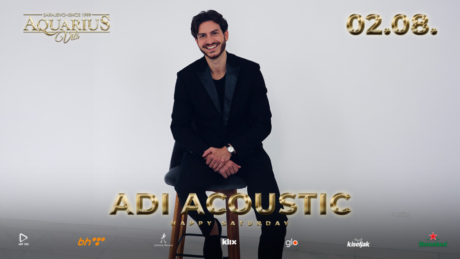 Prva subota u ovom mjesecu 02.08. rezervisana je za mladog muzičara koji je odavno postao simbol dobre klupske svirke u Sarajevu. “Happy saturday” event u Aquarius Vilsu je rezervisan za Adia Acoustic a ako je suditi po zadnjem njegovom nastupu, očekuje se još jedna odlična svirka u ugodnoj atmosferi.