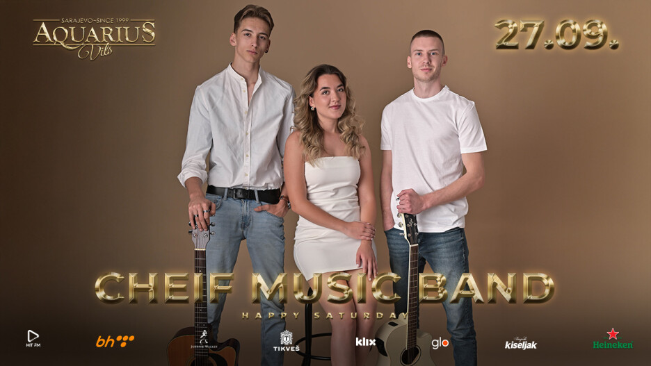 Posljednji vikend u septembru, subota 27.09. rezervisan je za vrlo talentovanu mladu ekipu – Cheif Music Band. Njihovi nastupi su obilježeni opuštenom atmosferom i dobrom muzičkom vibrom a cijela ekipa svoju super pozitivnu energiju vrlo jednostavno prenese na publiku. Cheif Music Band je svojevrsno muzičko otkrivenje koje svojim nastupima prisutnu publiku ostavlja bez teksta. Poslušajte Cheif Music Band u Aquarius Vilsu u subotu 27.09. i sigurni smo da nećete požaliti.